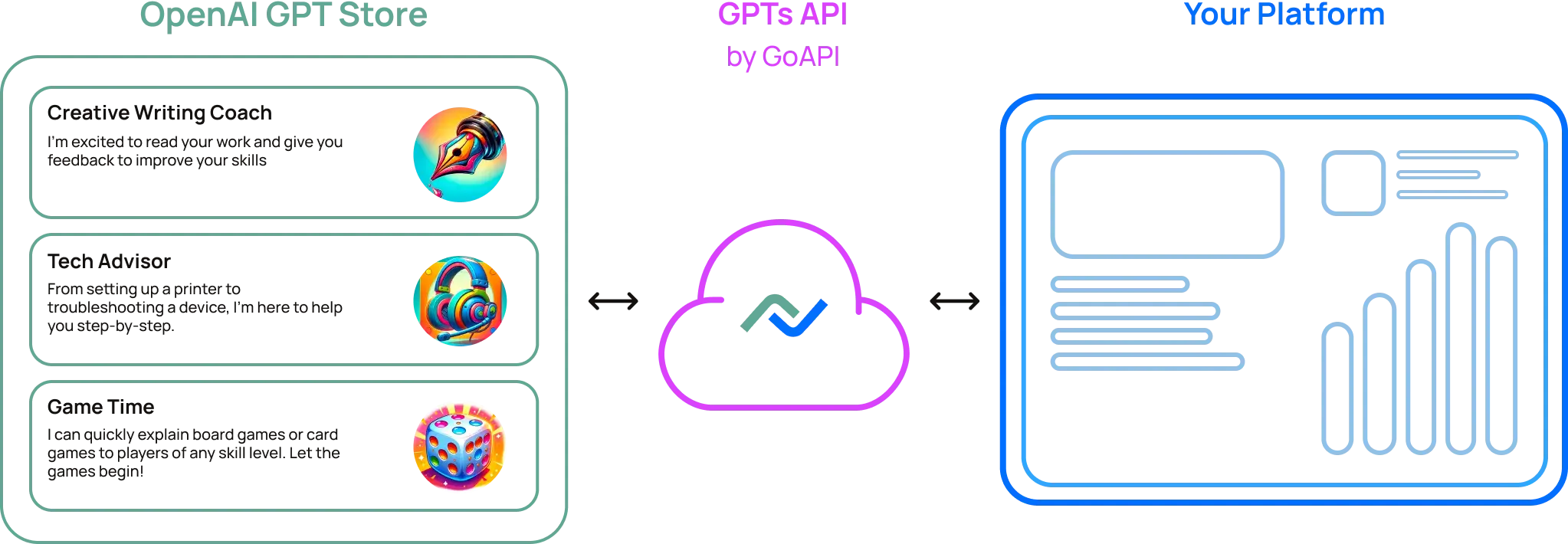 GoAPI provides GPT API for your development needs, you can now add GPTs, along with all its capabilities and features, into your own app, projects, or websites. Sign up now and happy integrating!